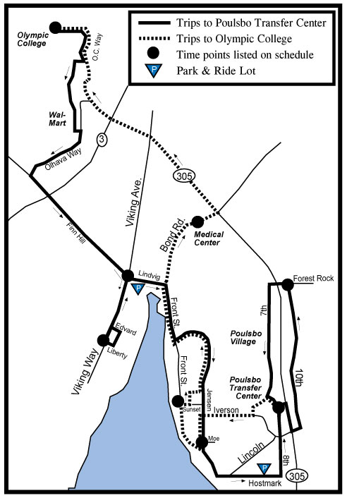 Service TimesWeekdays and Saturday Areas ServedPoulsbo Transfer Center, Doctors Clinic & Group Health, Downtown Poulsbo, NK Medical Center, Olympic College, Wal-Mart, Viking Avenue, Hostmark, Central Market, Poulsbo Village StopsThis bus will stop at marked stops. Schedule Effective: February 1, 2015 |