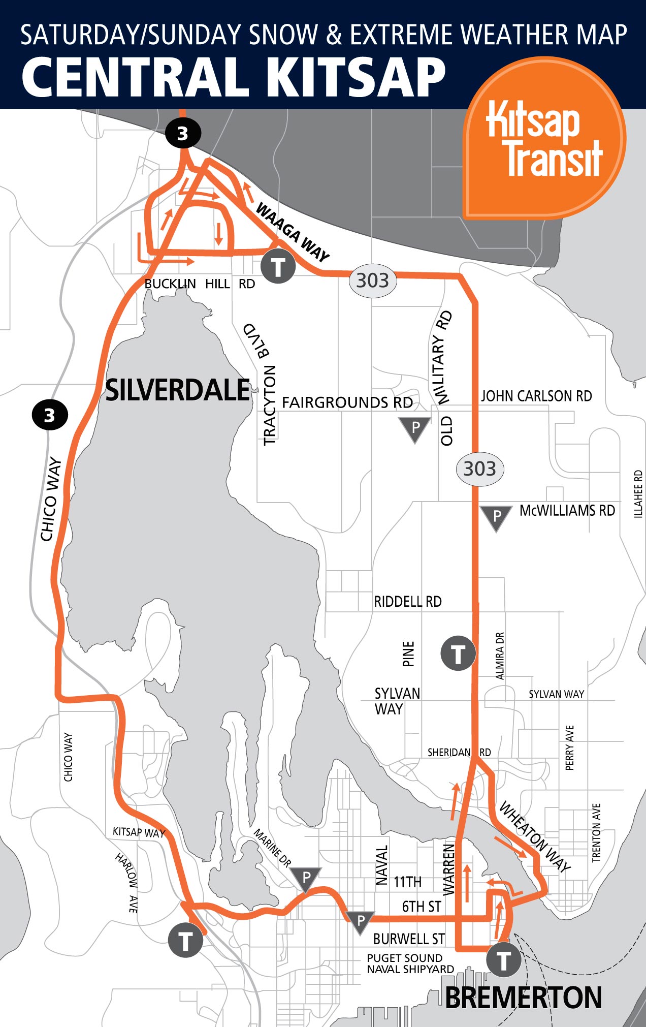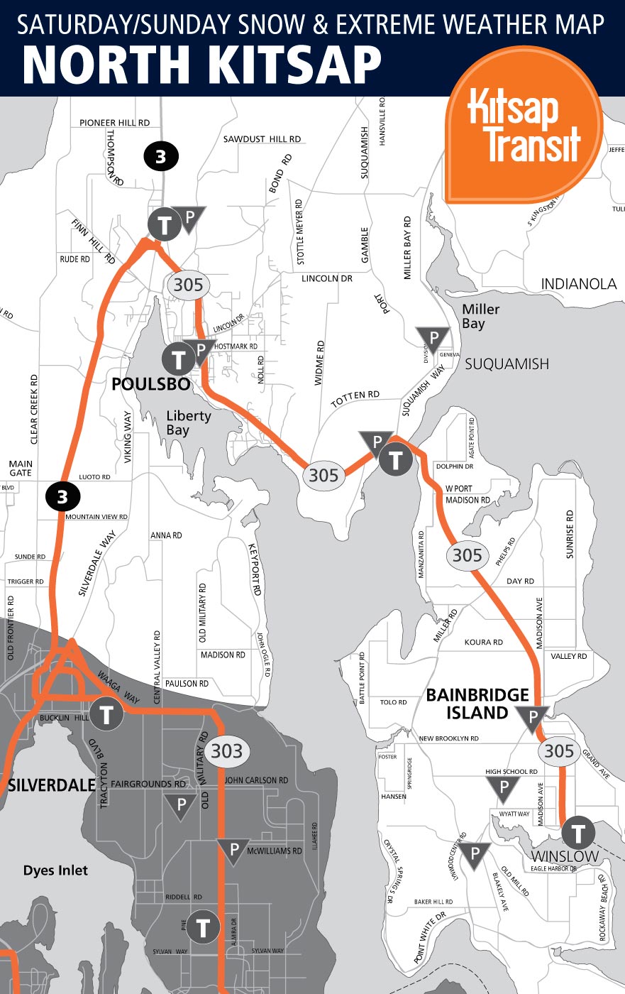 When Extreme Weather Hits...Check the current status on the Snow & Extreme weather page. As driving conditions improve, service will be upgraded gradually. We plan to make changes to service at 9 AM, Noon, 3 PM and 7 PM on weekdays and 10 AM and 3 PM on Saturday and Sunday. During Emergency Service operations, buses will not follow a regular schedule. Click here for start and end-of-service times. Customers are strongly encouraged to subscribe to Kitsap Transit's rider alerts. If you have questions, you can call 1.800.501.7433. Weekday Emergency Service | Saturday & Sunday Emergency Service | FAQs |