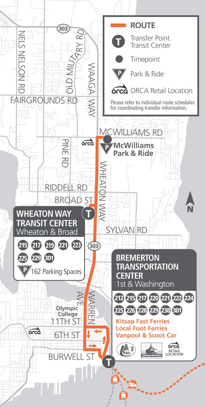 Service TimesWeekdays Only Areas ServedMcWilliams Park & Ride, Wheaton Way Transit Center, Wheaton Way, Washington Avenue, 11th Street, Warren Avenue, Burwell Street, Pacific Avenue, Bremerton Transportation Center StopsThis bus stops at marked stops. Schedule Effective June 8, 2025This route makes connections with Washington State Ferries (WSF). For WSF schedules, visit wsdot.wa.gov. |