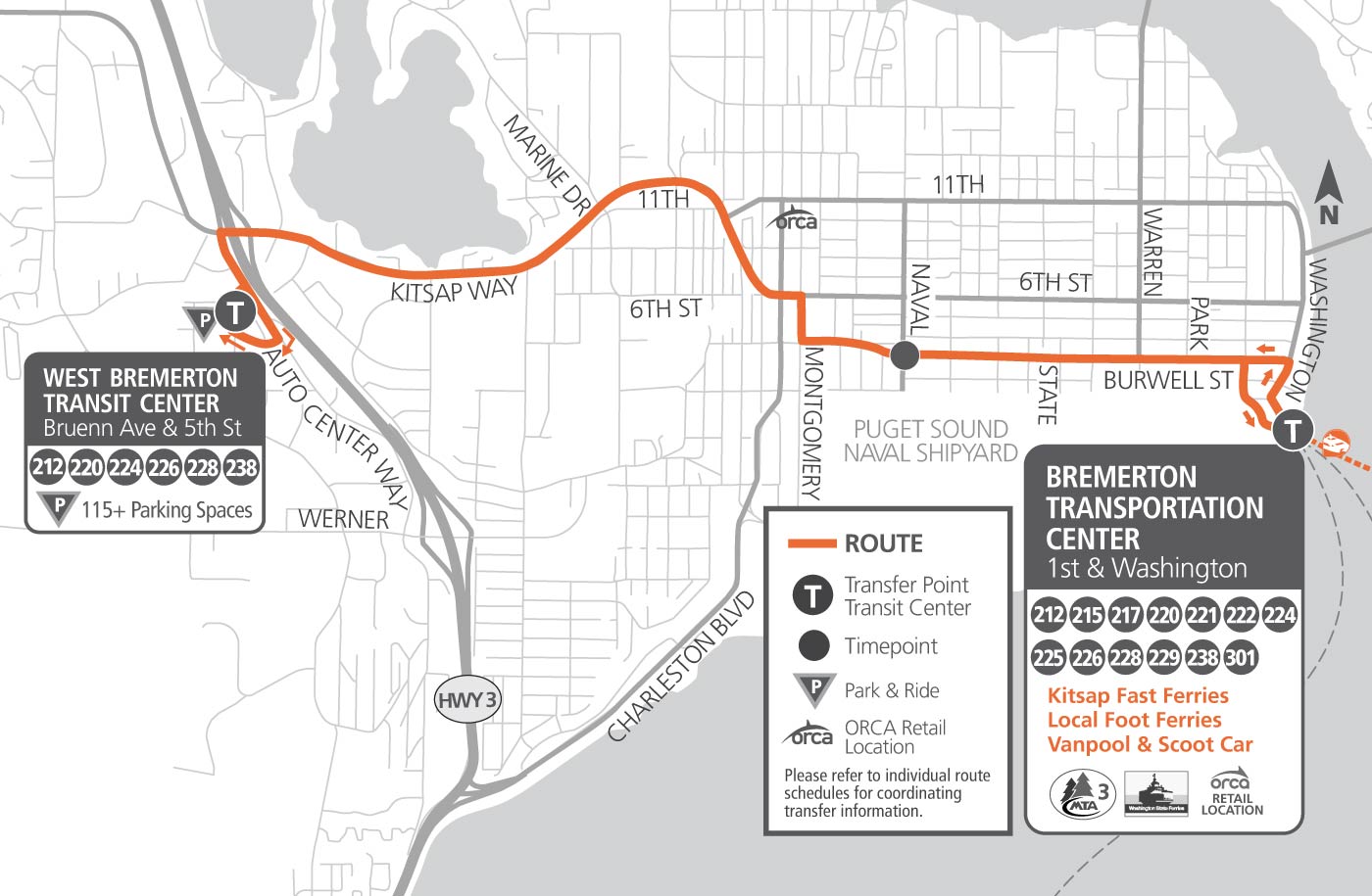 NOTE: Route 238 stops only at the timepoints listed and on Burwell Street at State Avenue and Park Avenue. On trips to Bremerton Transportation Center, Route 238 can stop on Pacific Avenue at the Puget Sound Navy Museum.