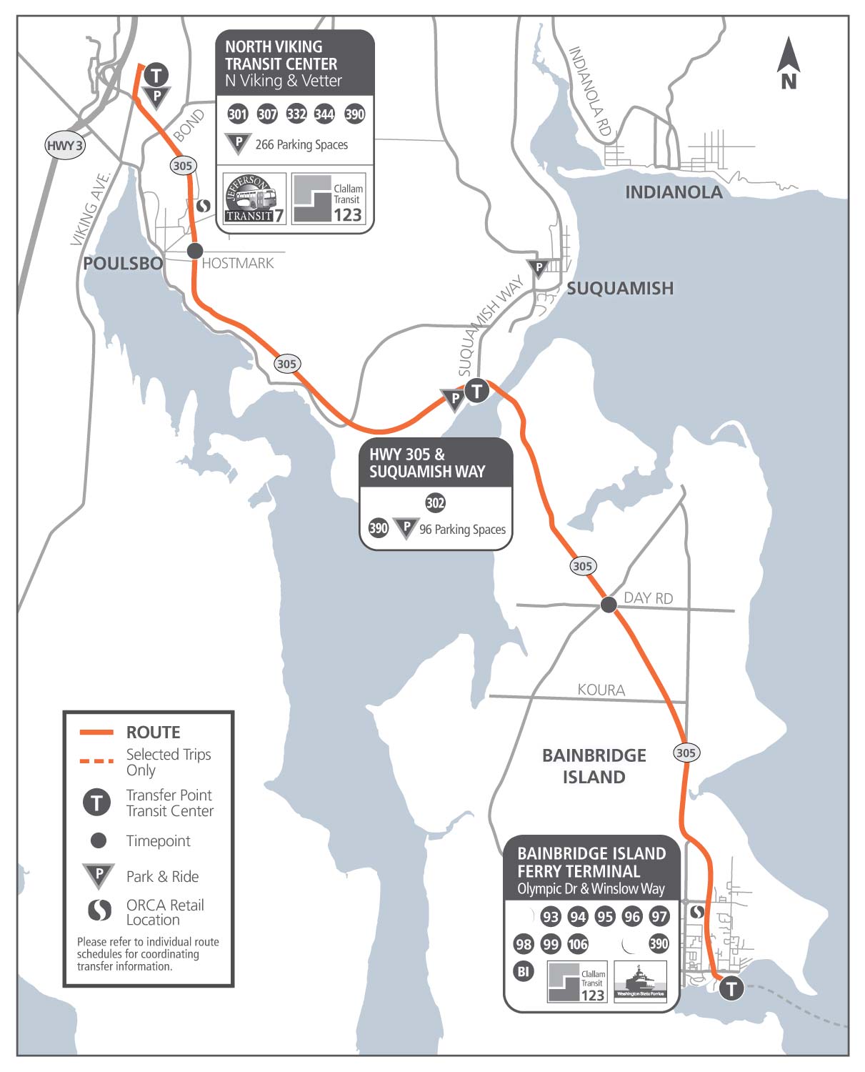 Service TimesMonday through Sunday Areas ServedNorth Viking Transit Center and Park & Ride, Clearwater Park & Ride and Bainbridge Island Ferry Terminal StopsThis bus will stop at all marked stops. Schedule Effective June 8, 2025This route makes connections with Washington State Ferries (WSF). For WSF schedules, visit wsdot.wa.gov. |