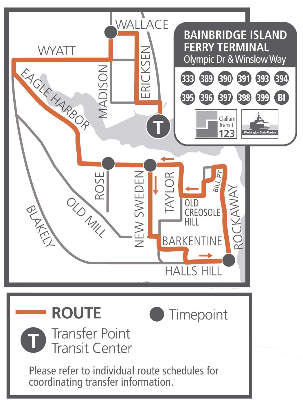 Service TimesWeekdays Only Areas ServedBainbridge Island Ferry, Wallace, Eagle Harbor, New Sweden, Rockaway Beach, Bill Point, Barkentine StopsIn rural areas on Bainbridge Island, passengers can flag down buses in a safe location where there are no fixed stops nearby. Please wait for the bus to pull over and come to a complete stop. Passengers must catch the bus at a fixed stop in the downtown core. Schedule Effective March 15, 2026This route makes connections with Washington State Ferries (WSF). For WSF schedules, visit wsdot.wa.gov.